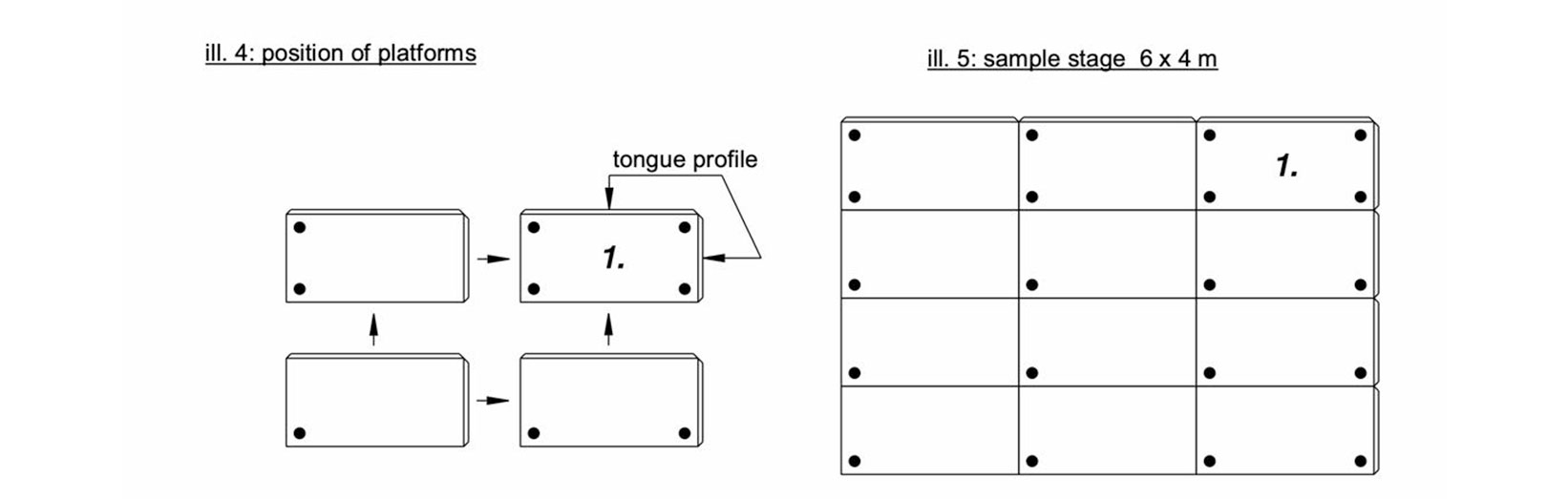 Når scenen skal bygges: Begynn alltid å bygge scene innerst i høyre hjørne. Start så med han siden på podie frem og til høyre.